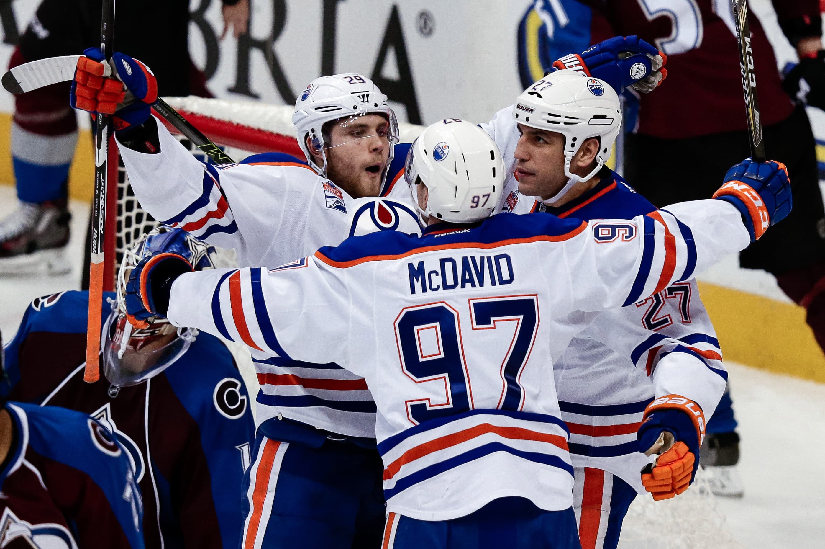 Nov 23, 2016; Denver, CO, USA; Edmonton Oilers center Connor McDavid (97) and left wing Milan Lucic (27) celebrate the goal of center Leon Draisaitl (29) in the third period against the Colorado Avalanche at the Pepsi Center. The Oilers won 6-3. Mandatory Credit: Isaiah J. Downing-USA TODAY Sports