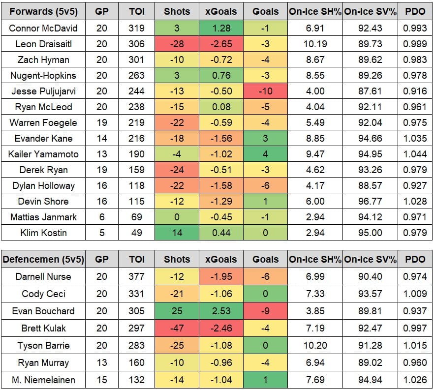 The table below lists the Oilers skaters from the first twenty games of the season, and includes each player’s on-ice shot differential, expected goals differential and actual goal differential, all at even-strength (5v5). A basic heat map has been applied to show how each player compared against their teammates.