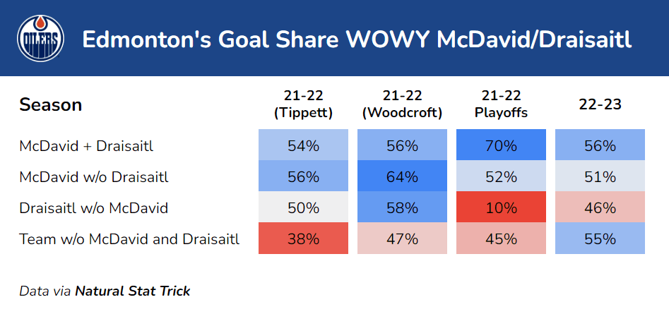 Due to the coaching change, last season’s results will be split into “Tippett” and “Woodcroft” sections. Here’s a look at how the team performs with and without McDavid and Draisaitl: