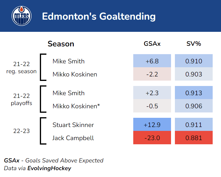 In the regular season in 21-22, Mike Smith was genuinely good. He ranked 7th among all goaltenders in goals saved above expected. However, he was a roller-coaster in the playoffs, with solid net results against Los Angeles, but he mightily struggled against the Avs. Still, both he and Koskinen are upgrades on whatever Jack Campbell has been this season. No goaltender in the Decade of Darkness has had a lower save percentage than Jack Campbell. As a result, Edmonton has been forced to rely quite a bit on Stuart Skinner.