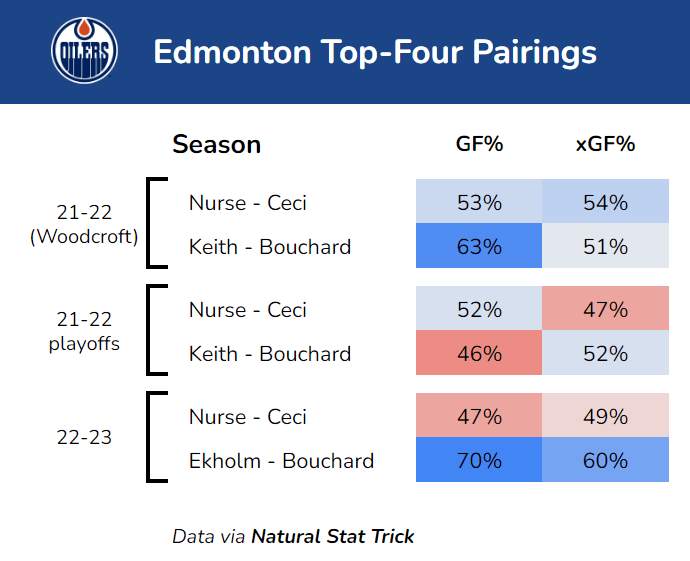 The upgrade from Keith-Bouchard to Ekholm-Bouchard is greater than most people think. The pairing of Ekholm-Bouchard has dominated in the minutes they’ve played.