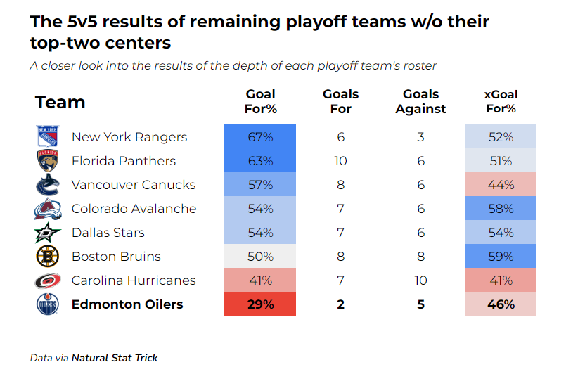 Some may point out that this method of analysis is unfair to Edmonton, as most teams’ top-two scorers will play on the same line, whereas McDavid and Draisaitl have centered their own separate lines for six of Edmonton’s seven playoff games. This is a fair point. So, here is a look at each playoff team’s results without their current top-two centers: