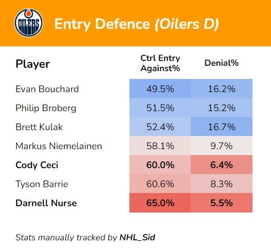Evan Bouchard has struggled with DZ puck management, and Kulak has struggled with DZ retrievals and puck battles, but they have been Edmonton’s best entry defenders this season, ranking well above league-average in zone denial% and controlled entry against%. On a team with considerable issues at defending the rush, Bouchard and Kulak are its bright spots. In a smaller sample, Broberg has also performed well.