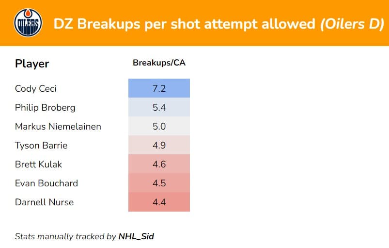 Again, I only track this for the Oilers (Corey Sznajder did track this for the playoffs last season), so I don’t know the league average. It’s safe to say that none of Nurse, Bouchard, Barrie or Kulak are exceptional at breaking up the cycle, but Ceci ranks very well here. With all of this, although I try to be as objective as possible, there is a decent amount of subjectivity with a statistic like DZ Breakups. Still, per Corey Sznajder’s tracking in last season’s playoffs, Ceci also ranked first among Edmonton D in his manually tracked DZ breakups stat.