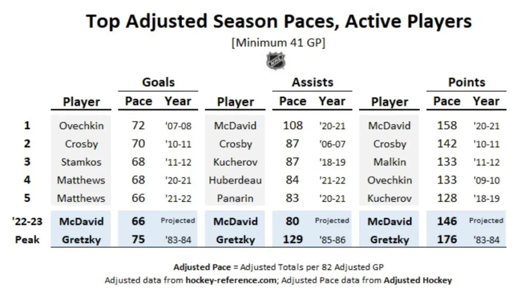 - Playmaking: No one active today is close to Gretzky’s best. McDavid did top a pace of 100 adjusted assists per season, but with full respect to the feat, it was in the abbreviated Canadian division season over just 56 games.