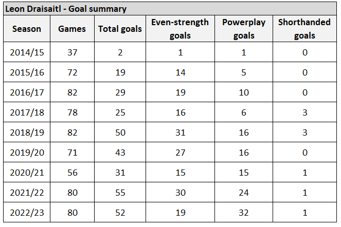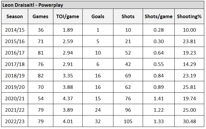 On special teams where he’s absolutely thrived, I think we can reasonably expect about 25 powerplay goals from Draisaitl this upcoming season. Table below is a summary of his powerplay history.
