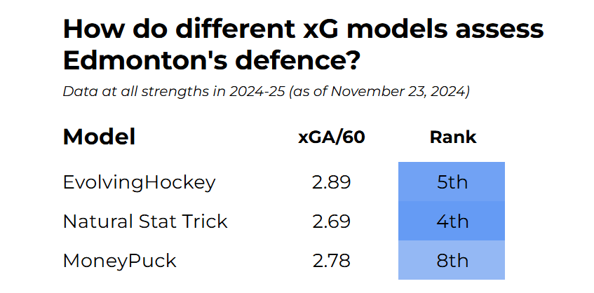 Now, different data sources can have slightly different methods of calculating expected goals, as they have their own models. So to strengthen the accuracy of this analysis, let’s look at how three differently commonly used models rank Edmonton’s skater defence: