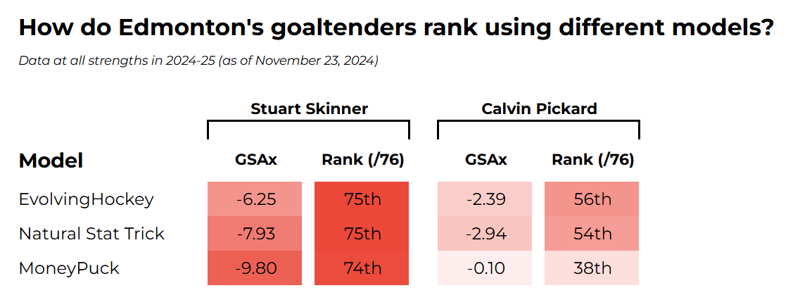 Edmonton’s starting goaltender is Stuart Skinner, who has appeared in 15 games, while their backup is Calvin Pickard, who has appeared in 8. Here is how they rank relative to the league in cumulative GSAx using three commonly used models:
