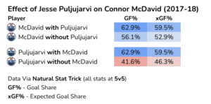 Sure, you could make the valid argument that any player’s stats would escalate when playing shotgun with the best player in the world, and this is the case with Puljujarvi. His numbers were obviously superior when alongside McDavid as opposed to without him. But the impressive thing to note here is that it also went the other way around; McDavid’s numbers improved when Puljujarvi was on the ice.