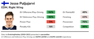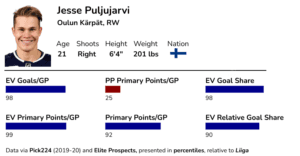 In 2021, Puljujarvi’s goals per hour with McDavid was 1.09 (compared to 1.17 in 17-18), and the duo had a 55% goal share and a 55% expected goal share (compared to 62 GF% and 59 xGF% in 17-18).