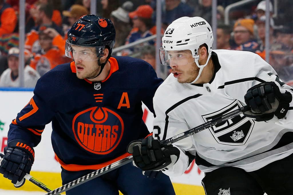Dec 6, 2019; Edmonton, Alberta, CAN; Edmonton Oilers defensemen Oscar Klefbom (77) and Los Angeles Kings forward Dustin Brown (23) follow the play during the second period at Rogers Place. Mandatory Credit: Perry Nelson-USA TODAY Sports