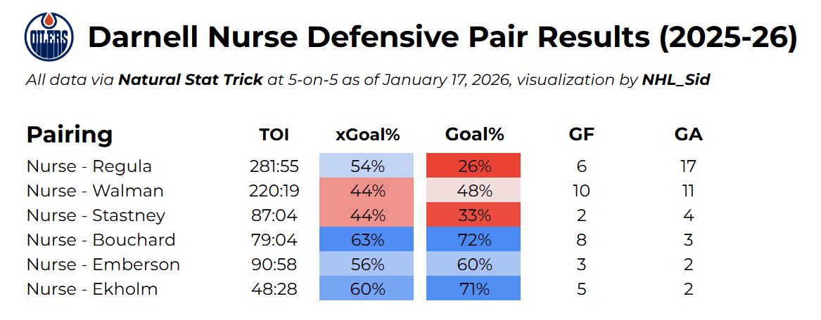 Here is a look at Nurse’s results with each of Edmonton’s current defencemen this season: