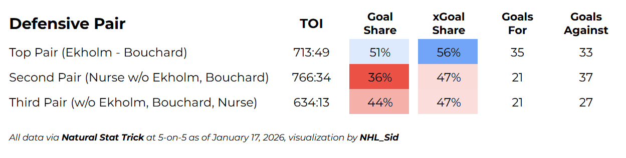 Secondly, they could try a top-pair of Nurse – Bouchard, allowing them to then have Ekholm and Walman either play together as a second-pair, or have each of them anchor their own pairings. This is an option with potential and could balance the top four. But, this is heavily dependent on the potential performance of Nurse – Bouchard and if they can sustain a strong goal differential as a full-time pair.