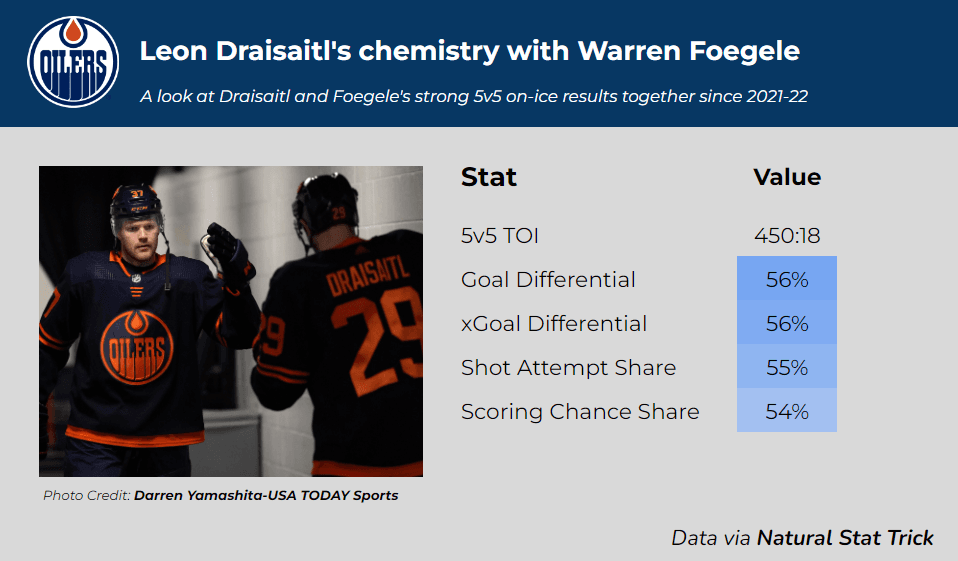In 450 minutes played together in the past three seasons, the team has out-scored opponents 31 to 24 at 5v5 with Draisaitl and Foegele on-ice. Both players see an increase in their goal and expected goal differential when they play alongside each other. It is evident the two players have solid chemistry together.