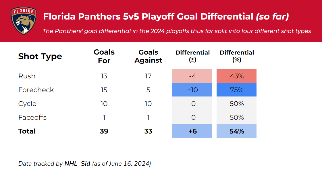 Before the finals began, I went back and watched every 5-on-5 goal Florida scored and every 5-on-5 goal they allowed. I categorized them into four different shot types – rush, forecheck, cycle and faceoff. Rush goals are any goals within ~6 seconds of a controlled zone entry, forecheck goals are any goals within ~4-5 seconds of a turnover or a dump-in recovery, faceoff goals are any goals within ~6 seconds of a faceoff win, and cycle goals are any goals coming off extended offensive zone time that do not meet the criteria of the other categories.