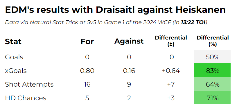 They didn’t generate any goals, but the trio of Leon Draisaitl, Dylan Holloway, and Evander Kane had an excellent two-way performance in Game 1. They sported a 66 percent expected goal differential overall, which improved to 83 percent when Heiskanen was on ice for the Stars. Specifically, they excelled at maintaining offensive zone possession.