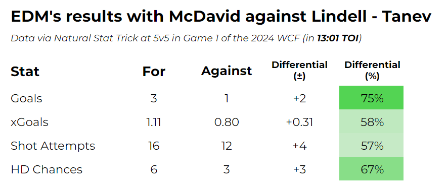 Overall, here is a look at Edmonton’s total 5-on-5 results with McDavid on-ice against Lindell and Tanev in Game 1:
