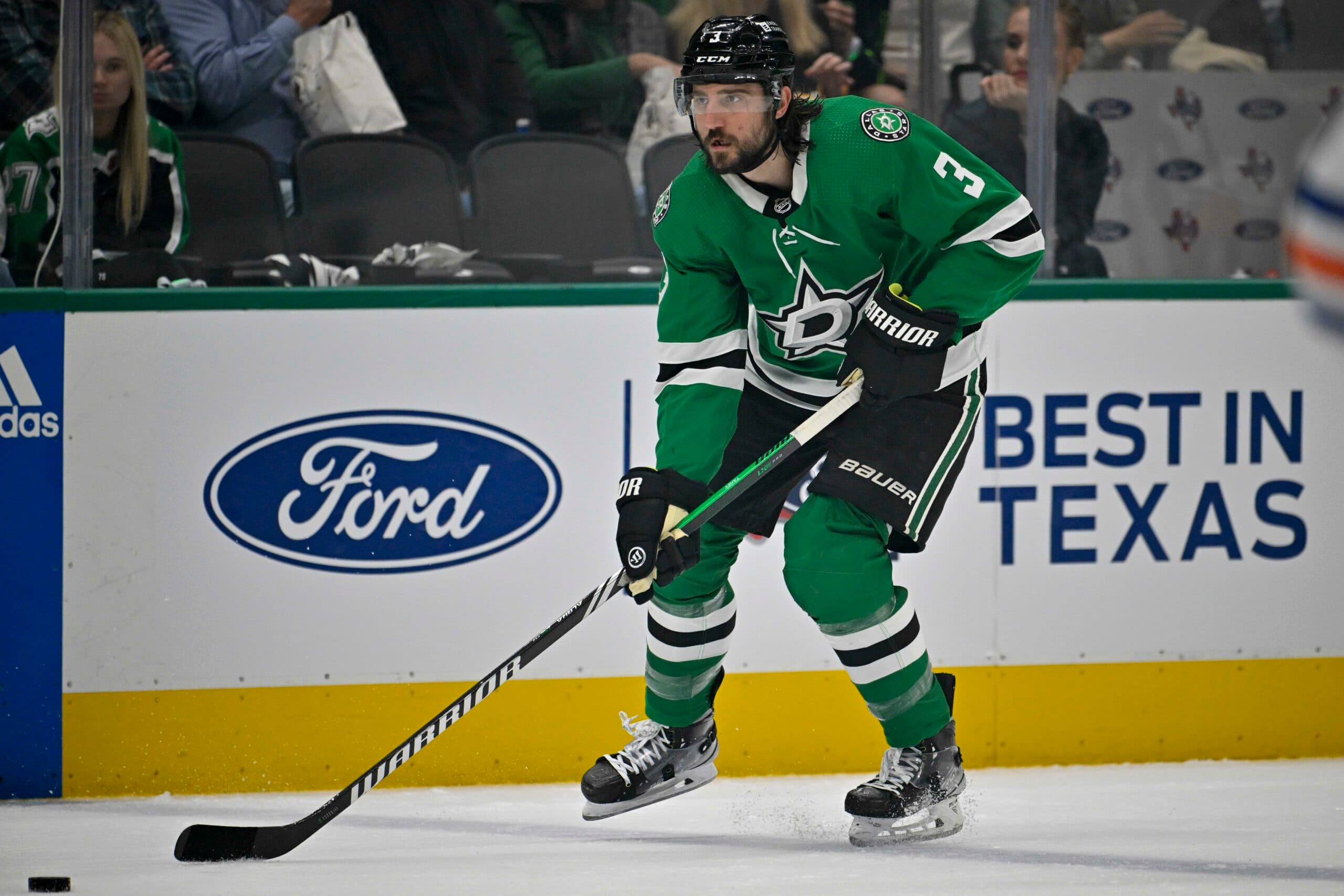 May 23, 2024; Dallas, Texas, USA; Dallas Stars defenseman Chris Tanev (3) skates against the Edmonton Oilers during the second period in game one of the Western Conference Final of the 2024 Stanley Cup Playoffs at American Airlines Center. Mandatory Credit: Jerome Miron-USA TODAY Sports