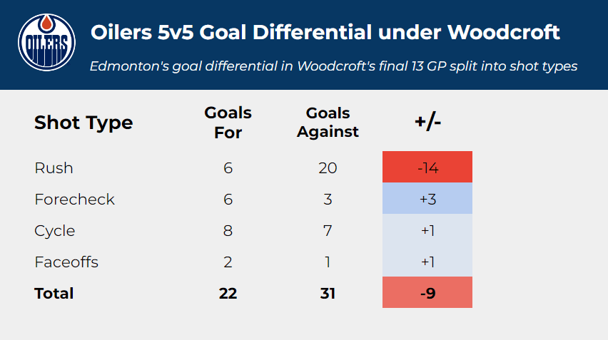 Here’s how Edmonton’s goal differential looked under Woodcroft and Manson, split into shot types:
