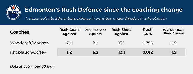 Under Woodcroft/Manson, the Oilers had an appalling 40 percent odd-man-rush shot differential. Under Knoblauch/Coffey, the Oilers are at a fantastic 58 percent odd-man-rush shot differential. They improved from 2.9 shots off odd-man-rushes against per 60 to just 1.5, nearly a full 50 percent improvement. Overall, Knoblauch’s Oilers have a 61 percent rush chance differential.