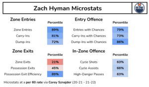 It’s a similar trend to Hyman’s defensive zone retrieval results. He ranked merely in the 34th percentile in DZ Retrievals, but his DZ Retrieval Success Rate ranks in the 81st percentile. From this, we can deduce that Hyman isn’t defensively involved to a large extent at 5v5, but when the puck is on his stick in the defensive zone, he’s efficient and responsible at moving it out.