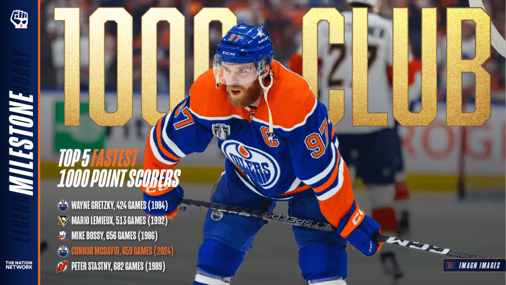 Connor McDavid buried a pass from Leon Draisaitl in the second period against the Nashville Predators to become the 99th player in NHL history to reach 1,000 career points. It was just the 659th game of McDavid’s career, making the 27-year-old the fourth-fastest to reach the mark in league history.