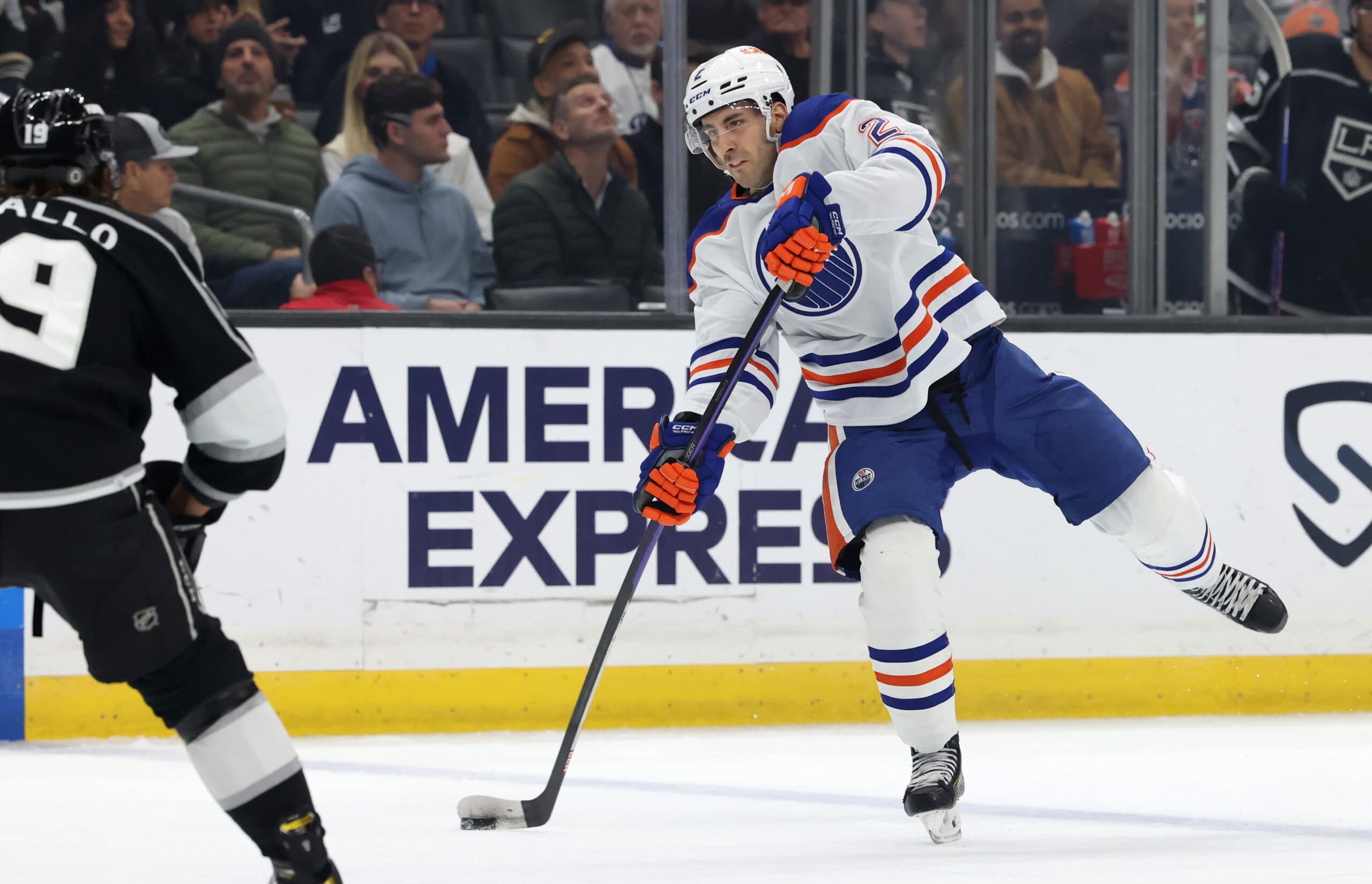 Jan 9, 2023; Los Angeles, California, USA; Edmonton Oilers defenseman Evan Bouchard (2) shoots during the first period against the Los Angeles Kings at Crypto.com Arena. Mandatory Credit: Jason Parkhurst-USA TODAY Sports
