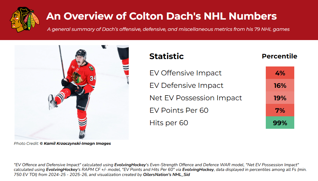 The third player that Edmonton acquired is 22-year-old forward Colton Dach, drafted in the 2nd round of the 2021 NHL Draft by Chicago. Having played 79 games in his NHL career thus far, I think the graphic below is an accurate summary of his NHL performance thus far: