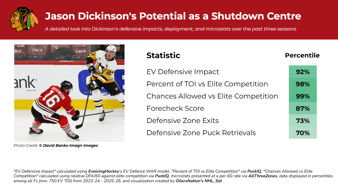 In terms of deployment, the most obvious way to deploy him is as a matchup centre against opposition top lines, exactly the role he handled in Chicago. Vasily Podkolzin, a strong defensive winger and relentless forechecker, looks like a natural fit beside him, and the two were already used together in Dickinson’s Edmonton debut. In theory, a dedicated matchup line built around those two could help stabilize Edmonton defensively and free up Connor McDavid and Leon Draisaitl to start more shifts in the offensive zone against weaker competition.