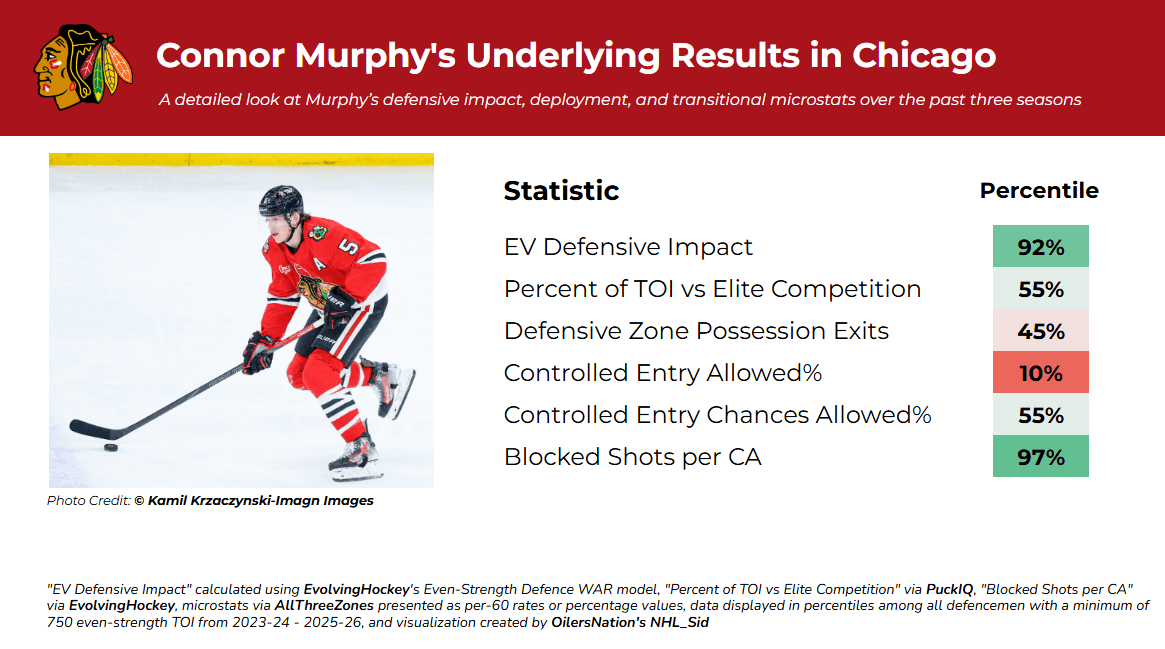 Murphy is perhaps the textbook definition of an effective “cycle-buster.” Though he may not be the most aggressive entry defender, he is absolutely an aggressive in-zone defender. Murphy is excellent at using his size and physicality along the boards to disrupt plays and break up passing lanes. He is also superb at defending the front of the net and taking away the middle of the ice, as seen by the fact that Chicago sees a significant reduction in slot shots with Murphy on-ice. Even when opponents do manage to get pucks through, Murphy excels at getting in the way, ranking in the 97th percentile in blocked shots per on‑ice attempt against.