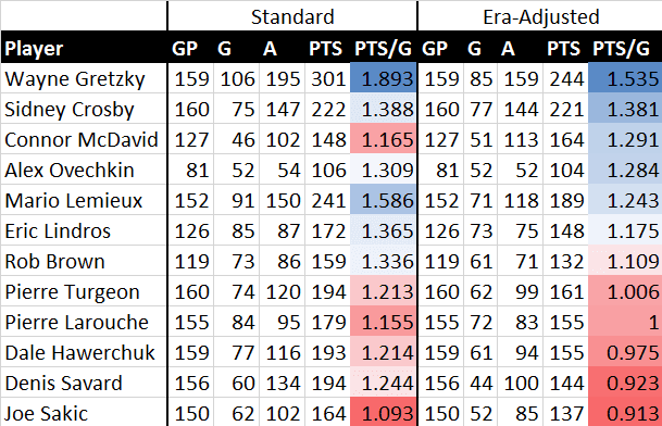 These are the best Age 19+20 performances that the NHL has seen, adjusted for goal scoring in respective eras. Pulling out Ovechkin, because he leaped straight in at 20, and the competition here is pretty clear. It’s Gretzky, it’s Lemieux, its Lindros, it’s Crosby. Unsurprising, really; we’re talking about the other four players who came into the league with the hype of potentially being the next saviour of hockey. When you say that McDavid is making a lot and compare him to his peers in the NHL today, it seems lopsided, but his peers are the history books and his target is no longer being one of the best in the league, it’s being one of the best of all time.