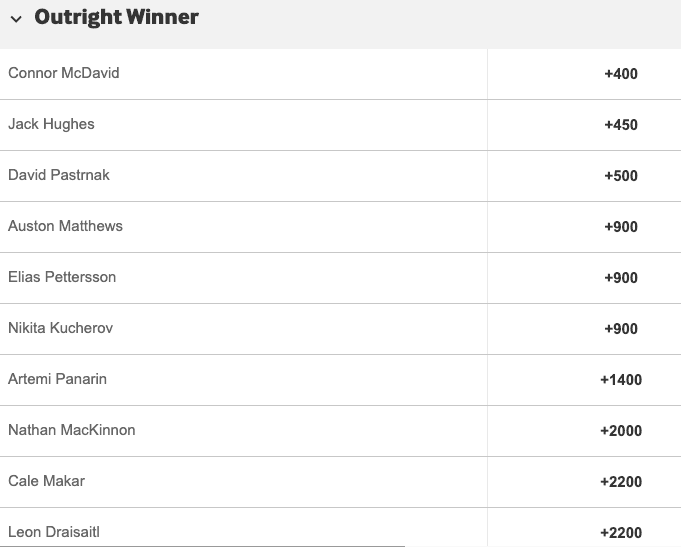 For those unfamiliar with the betting language, his implied odds were basically 50%. It was McDavid vs the field and at the time, I wasn’t a fan of betting on McDavid at that price. I felt like with the risk of injury, the juice wasn’t worth the squeeze.