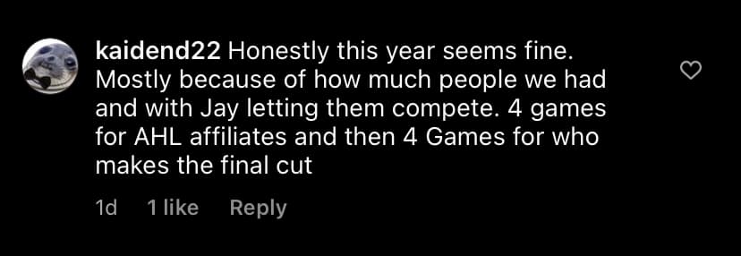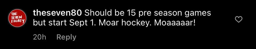Over on Instagram, theseven80 says we should have 15 pre-season games (!!!) but start on September 1st. I won’t lie, the idea sounds fun, however, I think after games five or four, I’d get a little bored of meaningless hockey. Meaningful for those battling for a roster spot that’s for sure. Some of those players would love an extra three to four games to prove themselves.