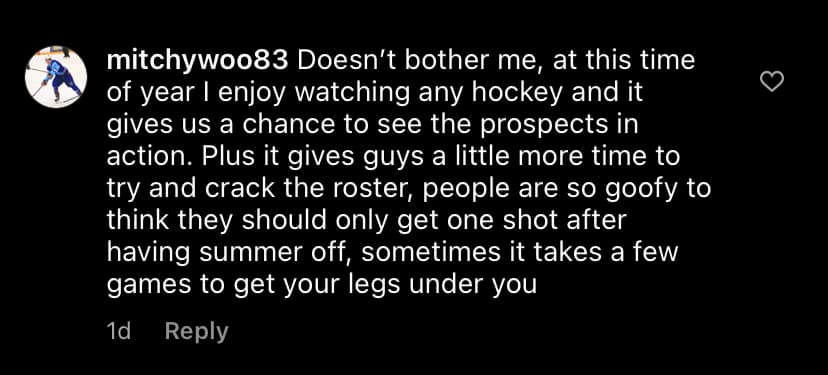 Easily my favourite comment I’ve seen is from Icebat_14. It’s important to remember some of these games are just to get a look at prospects and see how their development has gone. While giving the main group a little bit of game time is also just as important.