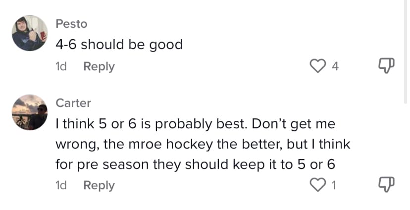 The crowd over on TikTok believes that 4-6 games is probably best. The more hockey the better Carter says, but maybe the NHL needs to find the right sweet spot for games. Five to six sounds pretty reasonable.