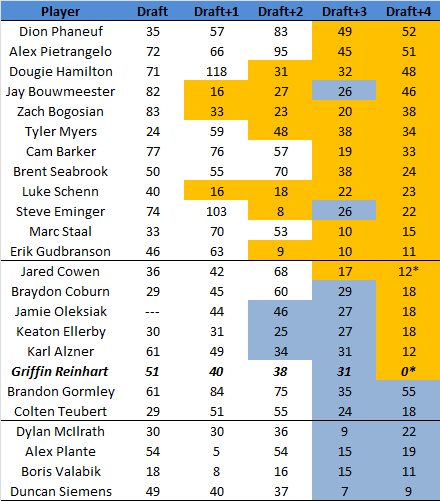 All three spent at least some time as top-four NHL defencemen, though Hainsey was the only one who was a long-term fit in the role. Even if we add that trio to my initial piece, however, it’s still looks unlikely (given development curve and comparables) that Reinhart is going to be a critical piece in Edmonton. Many players with similar career profiles flamed out entirely; others fall into the Jared Cowen/Keaton Ellerby range as pros.