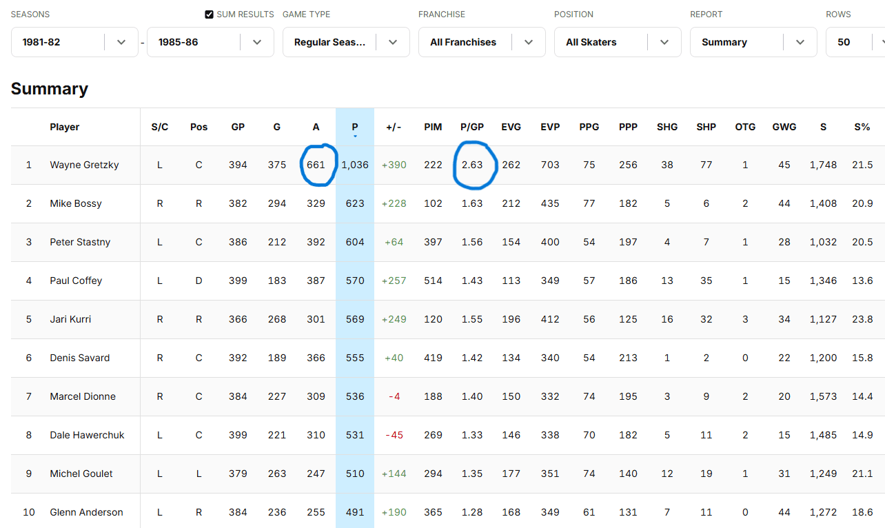 You will notice the Oilers played 400 games between 1982-1986 and scored 398 more goals than the Islanders, who were the second highest scoring team. Gretzky was the difference. He had 413 more points than second-place Mike Bossy, who led the Islanders. Gretzky had more assists than Bossy, who had 623 points. Bossy, who many have mentioned as one of the greatest goal scorers, scored 51, 58, 60, 61, and 64 in those five seasons but still had 81 fewer goals than Gretzky.