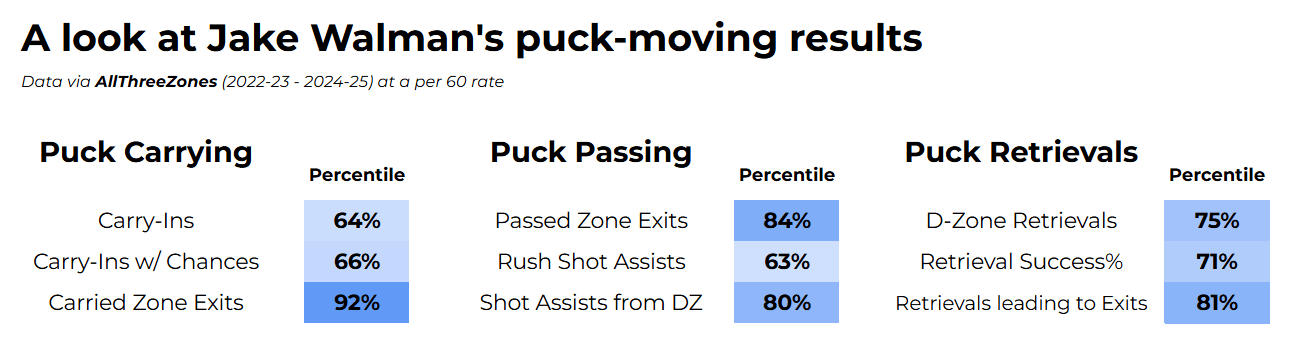 Overall, microstats from AllThreeZones rank Walman as one of the league’s most well-rounded puck-movers. His controlled exit rate ranks higher than 84 percent of all NHL defenceman over the past three seasons, and his total zone exit rate ranks higher than 91 percent.