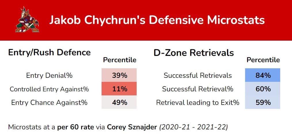Aside from entry defence and retrievals, there aren’t a ton of publicly available defensive microstats, but there are some snapshots of proprietary metrics online. Per Sportsnet and SportLogIQ, Chychrun ranked first in the league in stick checks, and eleventh in puck battles won in 2020-21.