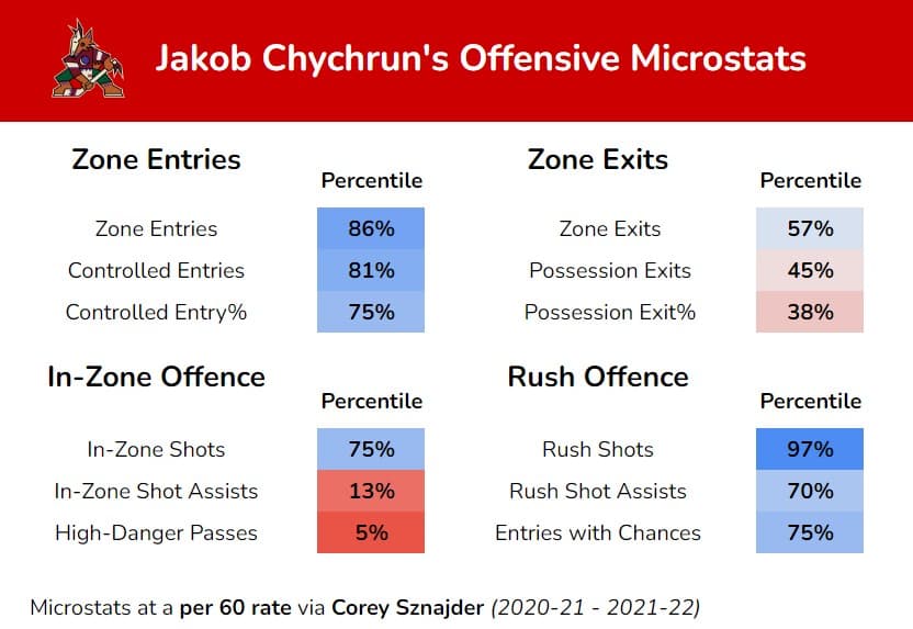 By a significant margin, Chychrun is Arizona’s best player at generating shots off the rush, including both individual rush shots and assists on rush shots. A notable portion of his zone entries lead to scoring chances for.