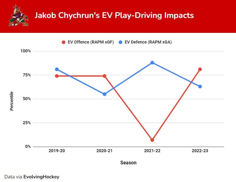 Predictably, his goal-scoring regressed in 2021-22, but so did his offensive play-driving. His impact on scoring chances cratered all the way towards the 7th percentile. His overall even-strength production was still fine for a defenceman, but Arizona generated significantly more scoring chances with Chychrun off-ice. However, his defensive impact improved to the 90th percentile.
