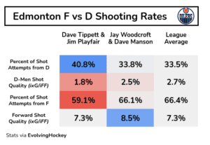Under Woodcroft and Manson, the rate of shots from Oilers defencemen is much closer to league average. Instead of spamming low-danger point shots, the defenceman are shooting more frequently for tips and deflections. The more notable difference is their improvement in shot quality, especially from their forwards.