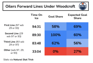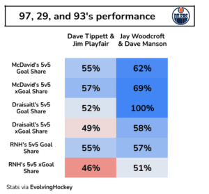 Overall, Edmonton was out-scored 30/49 under Tippett with McDavid and Draisaitl off-ice, a goal share of 37.9%. Under Woodcroft, their goal share has gone up by 7.4%, their expected goal share has increased by 1.8%, and their shot share has increased by 3.3%.