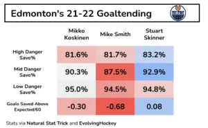 Edmonton ranks 25th in the league in Save%, and 24th in GSAx (Goals Saved Above Expected) per EvolvingHockey. Not good.
