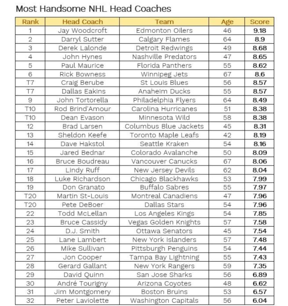 Now, despite my personal belief that Woody is the most handsome coach of them all, one might argue that having Daryl Sutter listed as the second most beautiful coach in the NHL could mean the app’s data is not quite correct, but I’m not here to robot kink shame and say that the numbers are wrong. In the words of Ricky Bobby, if you’re not first you’re last and that’s how I feel about this. All I know for sure is that our young, hip hottie of a coach is right where he belongs atop the mountain of handsomeness, and you will never convince me that the power poses don’t have something to do with it. And had they been able to measure his BDE then Woodcroft would have probably broken the app. As for the other NHL coaches, Washington Capitals head coach Peter Laviolette scored the lowest with a 6.04, trailing Jim Montgomery of the Bruins by a 0.53 margin.