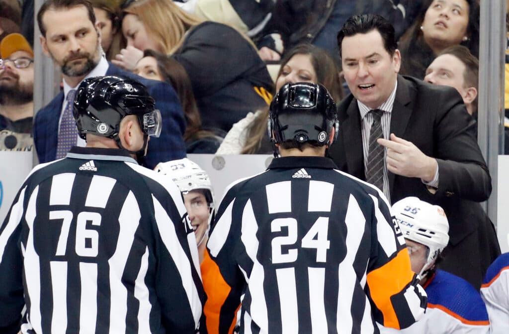 Feb 23, 2023; Pittsburgh, Pennsylvania, USA; Edmonton Oilers head coach Jay Woodcroft (right) talks to linesman Michel Cormier (76) and referee Graham Skilliter (24) against the Pittsburgh Penguins during the second period at PPG Paints Arena. Mandatory Credit: Charles LeClaire-USA TODAY Sports