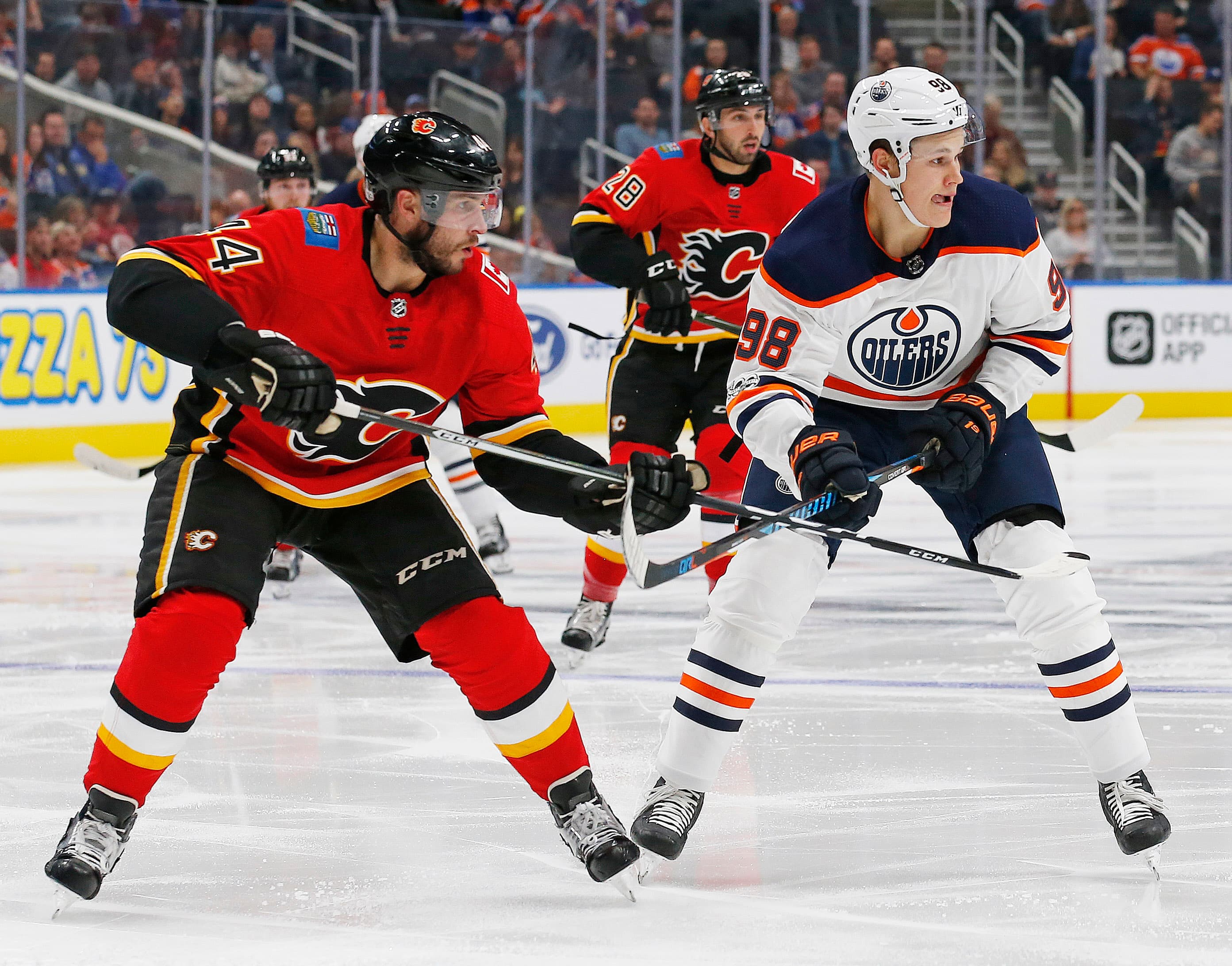 Sep 18, 2017; Edmonton, Alberta, CAN; Edmonton Oilers forward Jesse Puljujarvi (98) and Calgary Flames defensemen Matt Bartkowsjki (44) look for a loose puck during the second period at Rogers Place. Mandatory Credit: Perry Nelson-USA TODAY Sports
