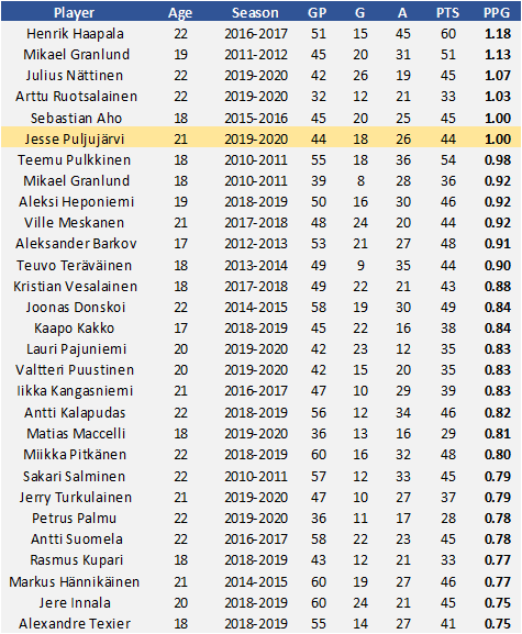Puljujarvi’s having a good season. To put his season into context I’ve sorted SM-Liiga players under 23-years old who scored within 25-percent of his production this season, who played minimum 20 games in a season since 2010.