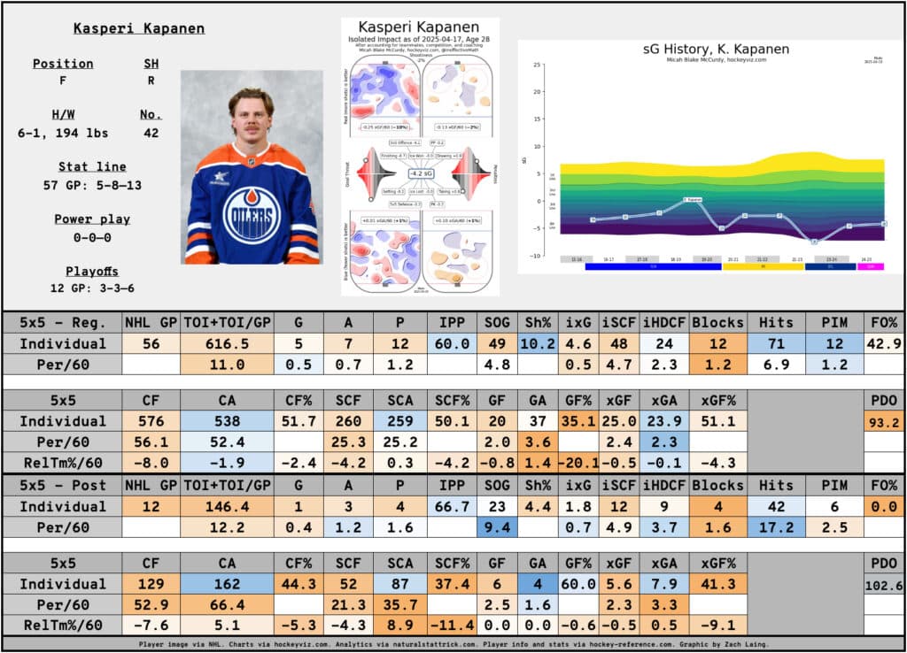 That’s about exactly what he was for the Oilers, but he showed an ability to jump up the lineup with some solid contributions and in the playoffs, his most common linemate at five-on-five was Leon Draisaitl. Two of Kapanen’s three playoff goals were assisted by Draisaitl, while Kapanen assisted on one of his in the Final.