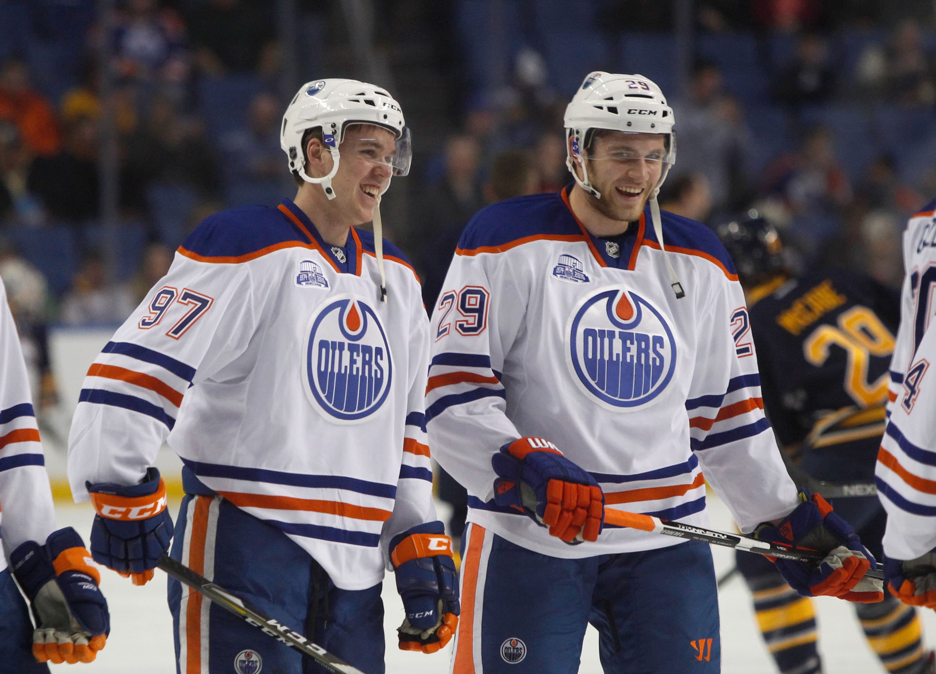 Mar 1, 2016; Buffalo, NY, USA; Edmonton Oilers center Connor McDavid (97) and center Leon Draisaitl (29) before a game against the Buffalo Sabres at First Niagara Center. Mandatory Credit: Timothy T. Ludwig-USA TODAY Sports